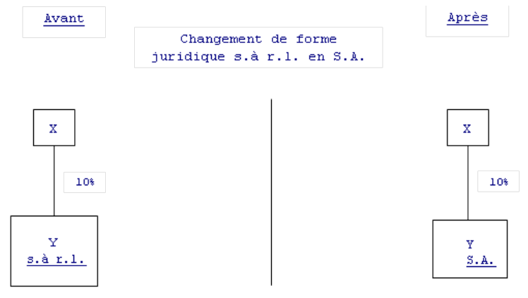 Lors de la transformation, X échange les titres de la société à responsabilité limitée Y (qui seront annulés) contre des titres de la société anonyme Y (émis lors de la constitution de cette société).