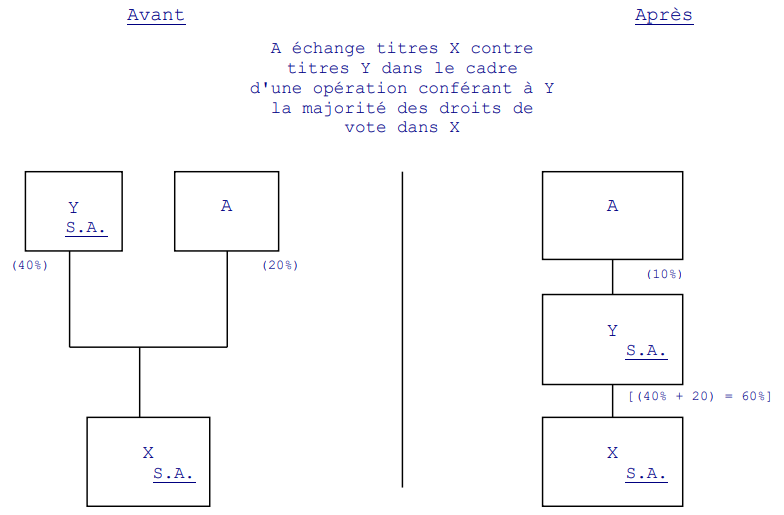 X et Y sont deux sociétés de capitaux résidentes pleinement imposables. Y détient une participation de 40% dans X (lui conférant 40% des droits de vote dans X). En date du 5 avril 2021, A, qui détient une participation de 20% dans X (lui conférant 20% des droits de vote), apporte cette participation dans Y. A reçoit en échange de son apport une participation de 10% dans Y.